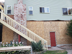 After that initial shock things started to get set in motion. The adjuster wrote us a check for half of the job and we had to sign that and send it to our mortgage company. Then they had a contractor come out to bid the job. That's when things got nuts! Our house was built in 1975 and of course the code for building house was not as high as it is now. Our house is a 2 story house, but it is built on a hill so the back side of our house is actually a little more than 3 stories high. We have a 17ft "crawlspace" under our house that we hope to eventually remodel into living space. That lower portion of the house was never sheeted. The siding was put directly over the studs thus making the siding structural. They were not going to be able to just rip all the siding off and put up new stuff. A structural engineer had to come look over our house and come up with a plan of action in how to proceed. The other two floors of our house also had inadequate sheeting. Some of it was pile wood and some of it was this other insulting boards that is not up to code.